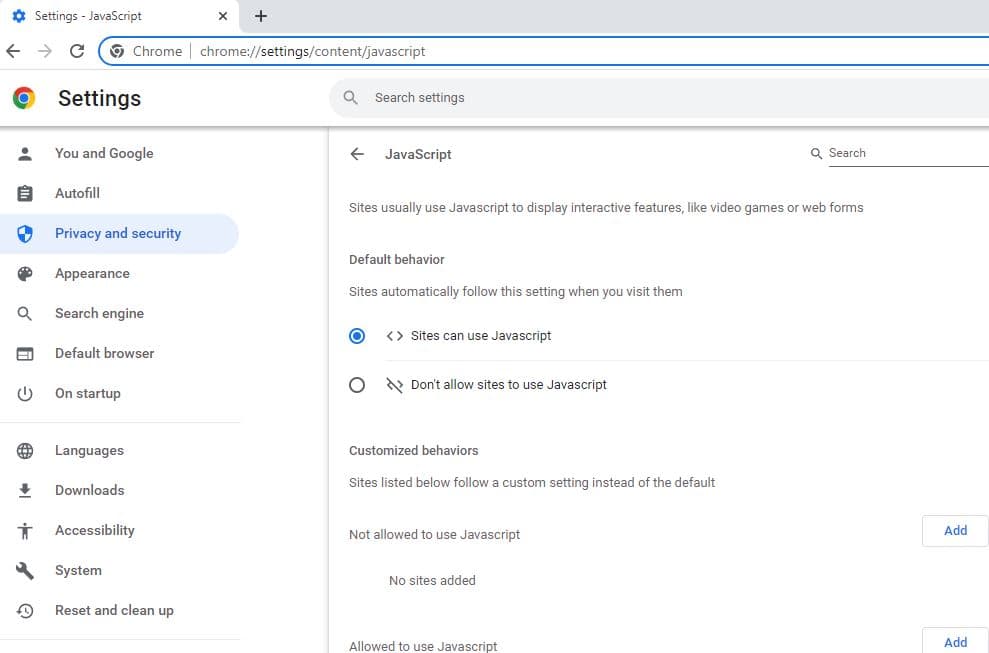 - Burada varsayılan davranışı seçin, radyo düğmesi siteleri JavaScript kullanabilir
