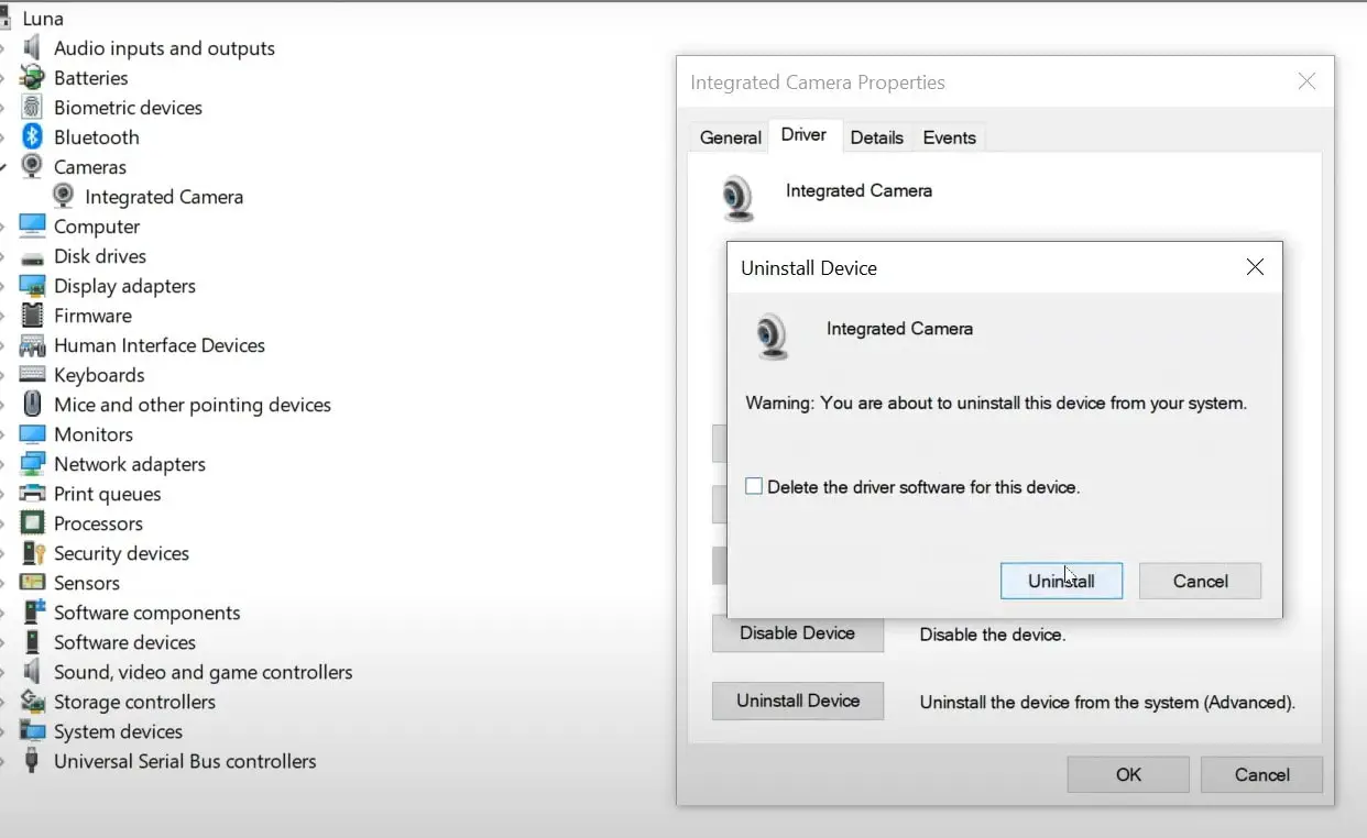 - Entegre kamera sürücüsüne sağ tıklayın. Seçin Seçin, tekrar onaylayın ve sistemi yeniden başlatın.