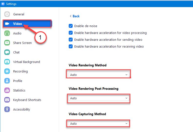 - Burada, gürültü, video işleme için donanım ivmesi, video gönderme veya video alma gibi tüm seçeneklerin kontrol işaretli olduğundan emin olun.