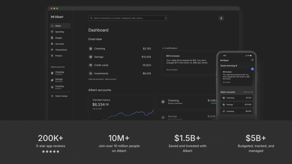10 milyondan fazla kişi tarafından kullanılan Albert, 50 milyondan fazla işlem izledi. OnunAkıllı para algoritmasıÖzel bütçeler oluşturur, otomatik olarak para tasarrufu sağlar ve yatırım yapmaya yardımcı olabilir. Kullanıcılar 250 dolara kadar nakit avans alabilirler.