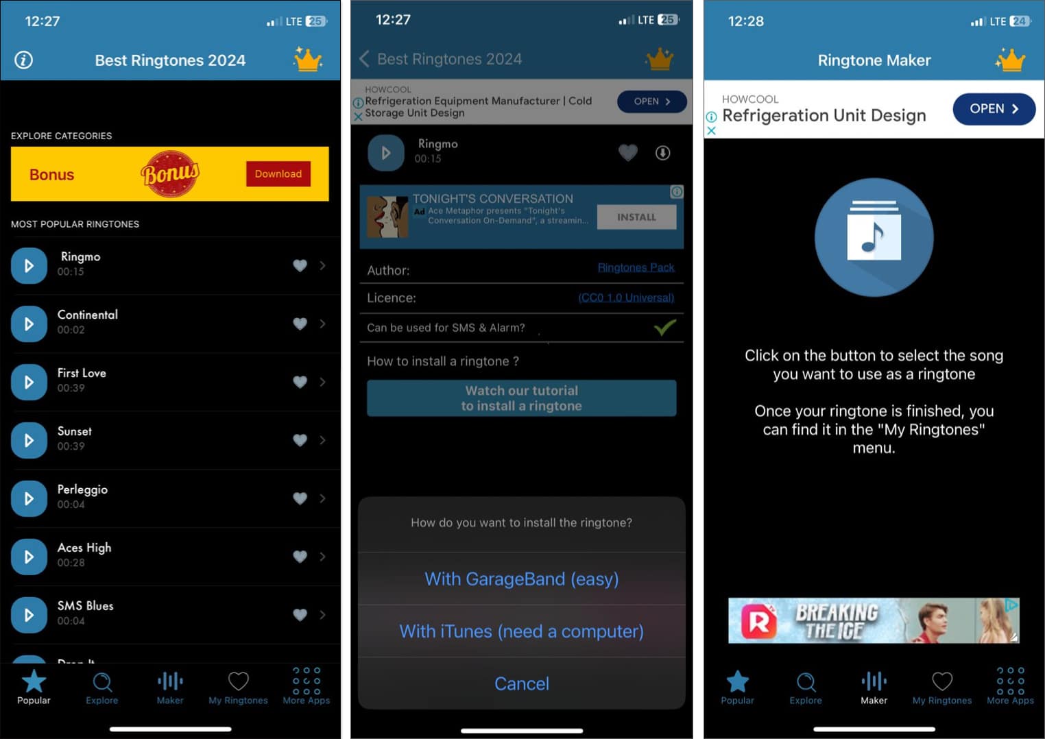 Uygulamadaki tüm zil seslerine erişmek ve indirmek için Premium sürümüne abone olmanız gerekir. Alternatif olarak, her bir indirmek istediğinizde zil sesleri ayrı ayrı satın alabilir veya üç reklam videosu izleyebilirsiniz. İndirilen tüm zil sesleriniz zil seslerime kaydediliyor. Daha sonra bunları iPhone'unuza eklemek için standart garaj bant yöntemini kullanabilirsiniz.