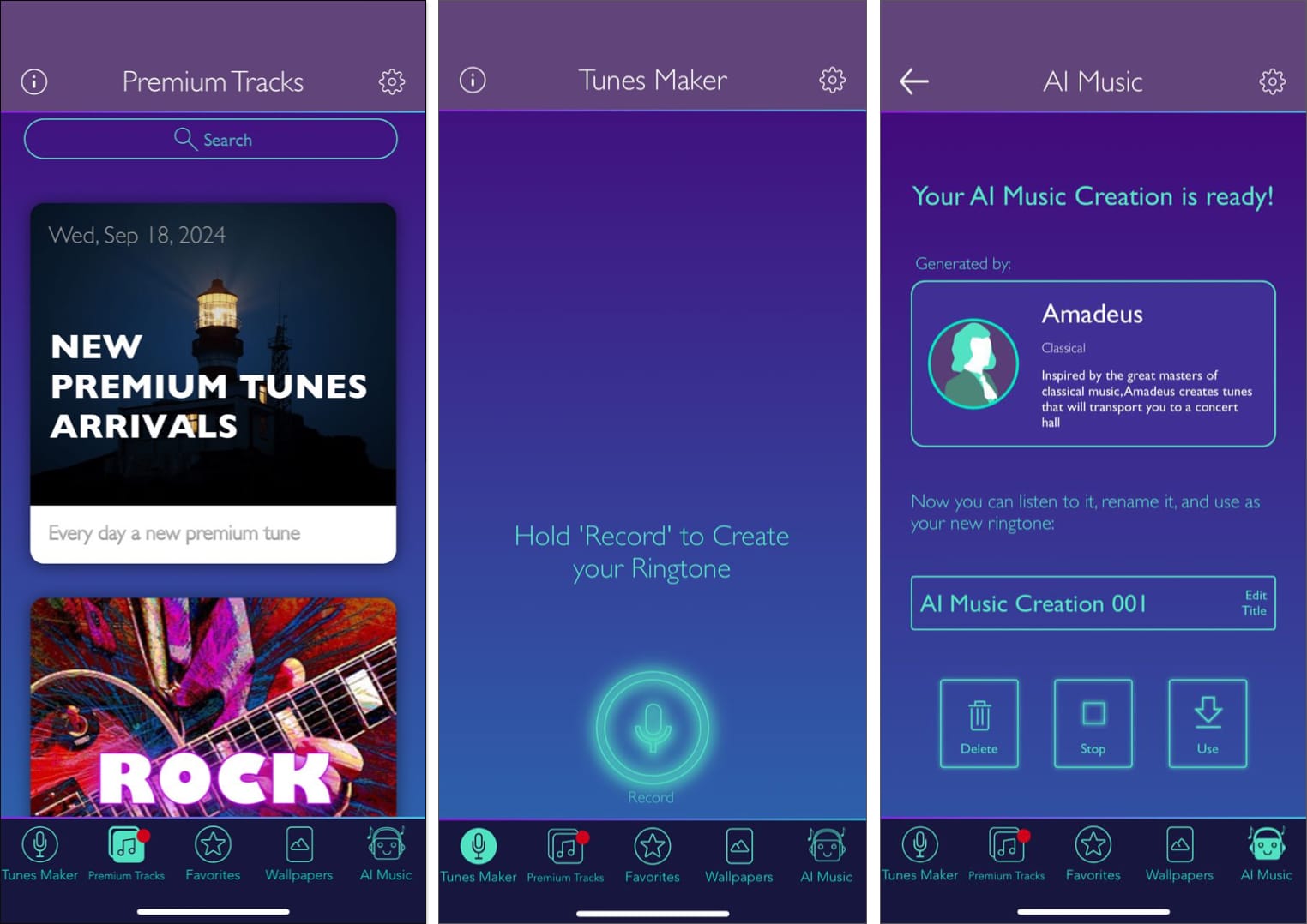 Bir zil sesi kaydedebilsem de, uygulama ücretli planı tercih etmeden kaydı bir zil sesi olarak eklememe izin vermedi. Ayrıca, ücretli kullanıcı olmadan premium parçalara erişemedim. İPhone için bu zil sesi uygulaması ayrıca, iyi bir duvar kağıtları koleksiyonunun yanı sıra AI ile sesler üretmenizi sağlayan bir AI müzik özelliği de içerir.