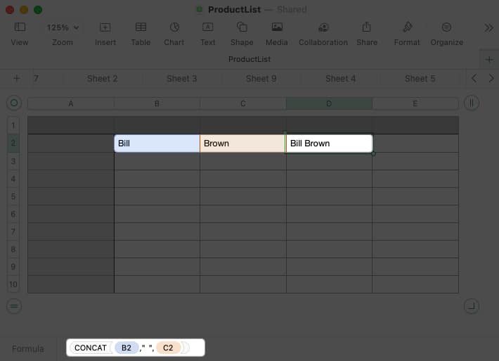 Konsat işlevini kullanarak farklı hücrelerden metin birleştirebilirsiniz. Örneğin, B2 hücresindeki adını ve C2 hücresindeki soyadı D2 hücresi ile birleştirebilirsiniz. Ayrıca adlar arasında bir alan (alıntılar içinde) de ekleyebilirsiniz. İşte formül ve alttaki çubukta nasıl göründüğü: