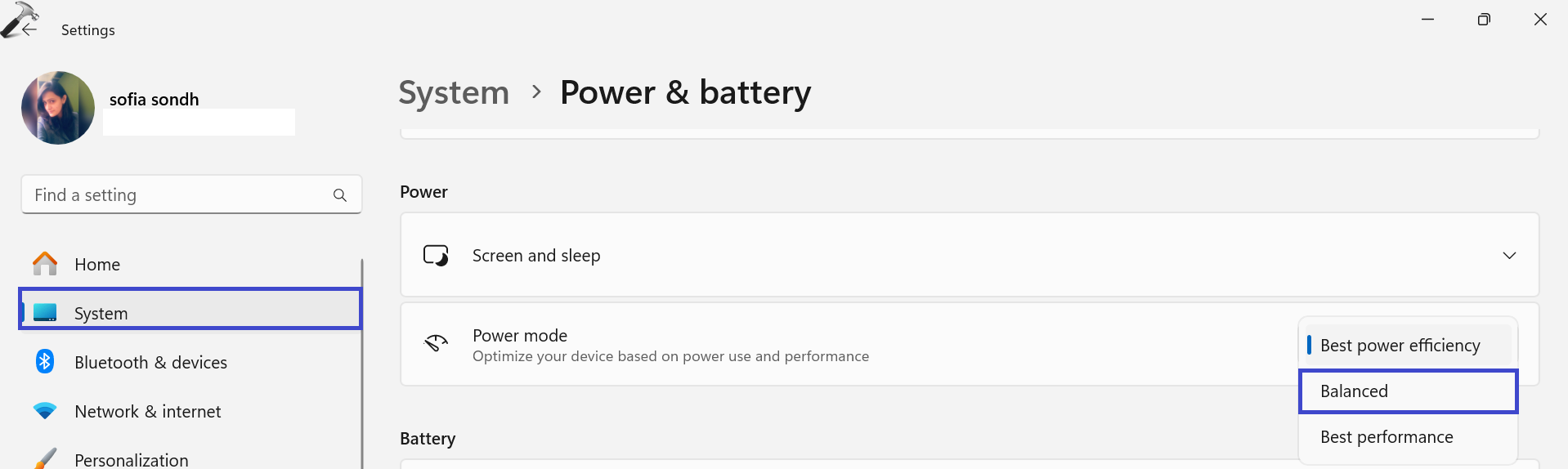 2. (…) tutulması üzerine tıklayın ”Güç modu”Seçeneği ve"Dengeli”Listeden seçeneği.