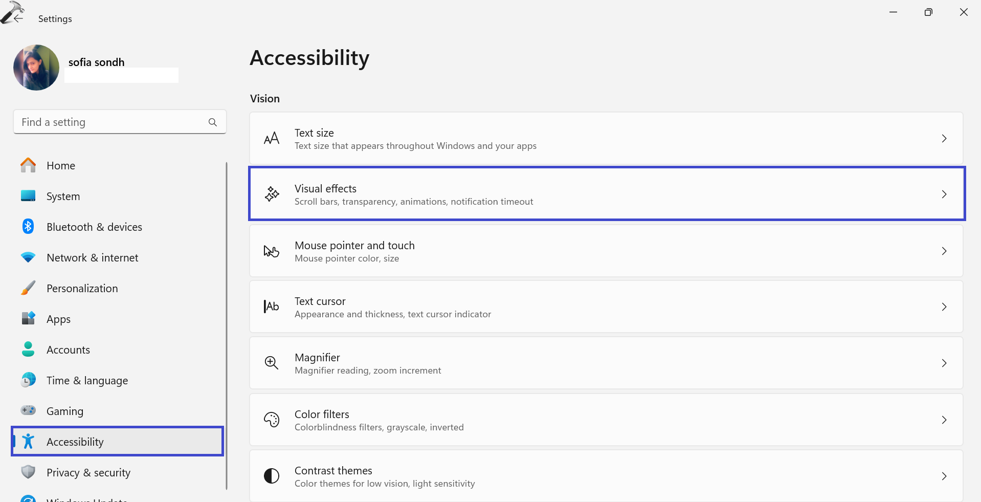 3. Bundan sonra, “Erişilebilirlik”Bölümünü seçin ve"Görsel efektler" seçenek.