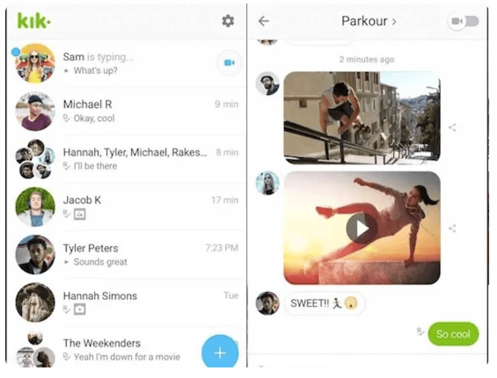 Kik, sosyal bir ağ havasına sahip bir mesajlaşma hizmetidir. Metin mesajları, ses ve görüntülü sohbetler, gifler, memler ve çıkartmalar gibi tüm olağan özelliklere sahiptir. Tartışma için önceden belirlenmiş konulara sahip grup sohbetlerini de bulabilirsiniz. Kik aracılığıyla yeni insanlarla tanışabilirsiniz veya sadece eski arkadaşlarınızla iletişimde kalmayı seçebilirsiniz.