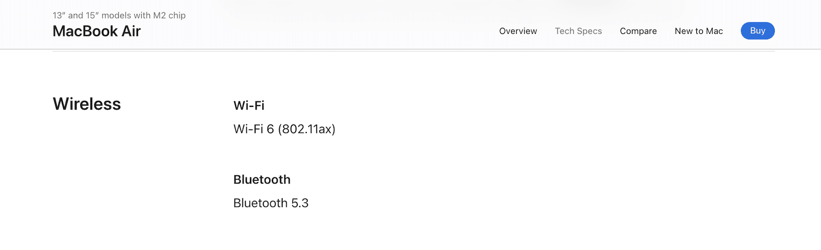 2022'de lansman sırasında, M2 yongası tarafından desteklenen 13 inç MacBook Air, Bluetooth 5.0'ı destekledi. Ve şimdi Bluetooth 5.3'ü destekliyor.eyaletlerDizüstü bilgisayarın teknik özellikleri sayfası.