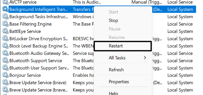 Temel Bluetooth hizmetlerinizin Windows 11 PC veya dizüstü bilgisayarınızda düzgün çalışmaması mümkün olabilir, bu yüzden Bluetooth işleviyle ilgili sorunlar yaşıyorsunuz. Bu durumda size öneriyoruzBluetooth hizmetlerini yeniden başlatınVe bunun sorunu çözüp çözmediğini kontrol edin. Bunları Windows 11 PC'nizdeki veya dizüstü bilgisayarınızdaki Hizmetler Yardımcı Programında kolayca yeniden başlatabilirsiniz: