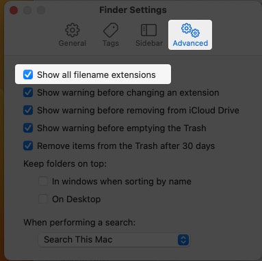 Dosya adı uzantıları almak içinBulucu→Tercihler→Gelişmişve etkinleştir"Tüm dosya adı uzantılarını gösterin"seçenek.