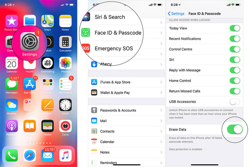 Tabii ki, bu özellik etkinleştirildiğinde, cihazınızın çocuğunuzun yakınında hiçbir yerde olmasını istemezsiniz. Ancak akışın daha güvenli tarafında olmak istiyorsanız, bu özelliği aklınızda bulundurmalısınız. Ayarlar ⟶ Touch/Face ID & Passcode ⟶ Sil verilerini açın.