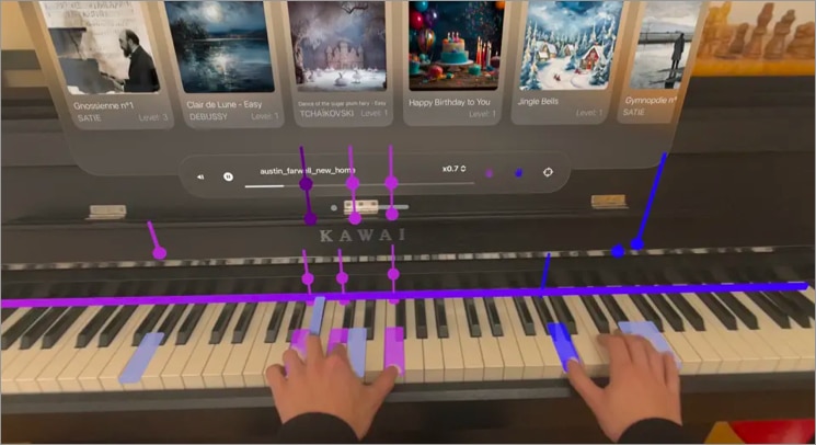 Evet! Uygulamanın interaktif müzikal fayansları, piyanonuzda notlar yüzerken şarkı boyunca size rehberlik edecektir. Apple Vision Pro'daki doğru hareket izleme sayesinde, bu uygulama el hareketlerini sorunsuz bir şekilde analiz edebilir ve buna göre talimatlar sağlayabilir.