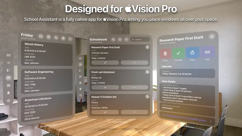Kişisel günlüğünüzdeki yaklaşan ödevlerinizi, sınavlarınızı ve projelerinizi planlamak için mücadele ettiğiniz günler geride kaldı. Bu görevleri Apple Vision Pro'nuzdaki okul asistanı ile kusursuz bir şekilde gerçekleştirebilirsiniz.
