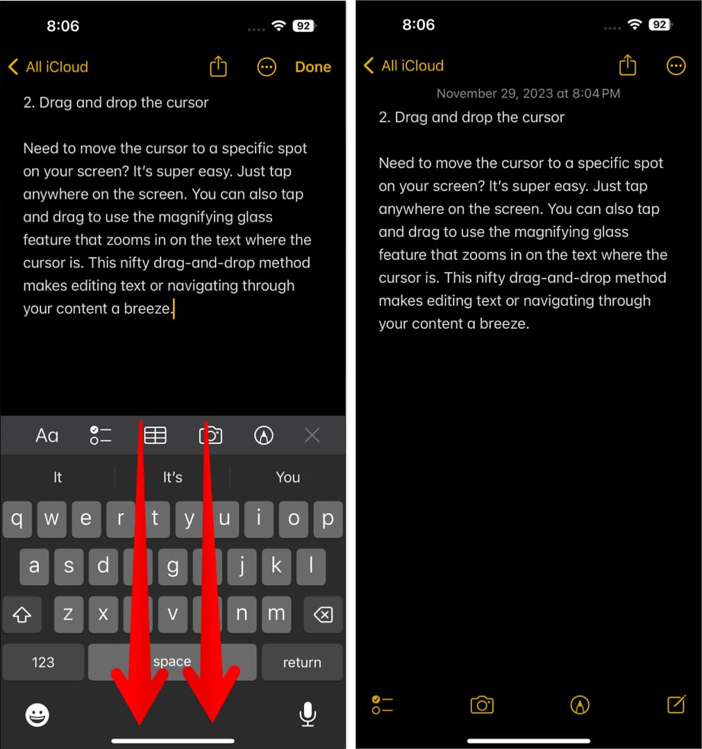 QuickPath özelliğinin yanı sıra, başka bir havalı iPhone klavye hilesi klavyenizi bir izleme noktasına dönüştürmektir. Bu, özellikle büyük bir metin parçasıyla uğraşırken kullanışlıdır ve imlecinizi yerleştirmek için kesin bir hassasiyete ihtiyacınız vardır.