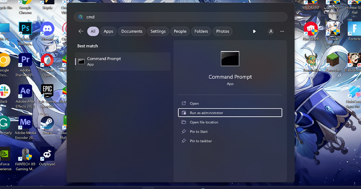 - AçıkBaşlangıç, arayınKomut istemive seçinYönetici olarak çalıştırseçenek.