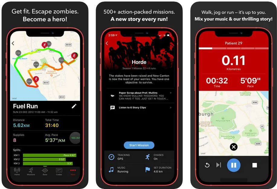 Bu popüler uygulama, yürüme, koşma ve koşunun fiziksel aktivitesini oyunlaştırmaya yardımcı olmak için oluşturuldu. Uygulamanın ana özelliği, zombiler tarafından kovalanma deneyimini çalıştırırken ve taklit ederken dinleyebileceğiniz kıyamet sonrası bir zombi hikayesidir. Aktif olduğunuzda hikayeyi devam ettirmek için görevleri tamamlayabilirsiniz.