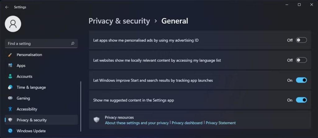 Windows 11, gizliliğe güçlü bir vurgu yapar ve verilerinizi yönetmenize olanak tanıyan ayarlara kolay erişim sağlar. Reklam Kimliği özelliğini burada gösterildiği gibi devre dışı bırakabilirsiniz: