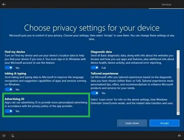 Windows'un yeni bir kurulumunu yapıyorsanız, iyi haber, gizlilik ayarlarınızı seçtiğinizde Reklam için geçiş anahtarını devre dışı bırakarak gizliliğinizi ilk aşamadan saklayabilmenizdir. Kurulum işlemini tamamlarken reklam kimliği geçişini devre dışı bırakın.