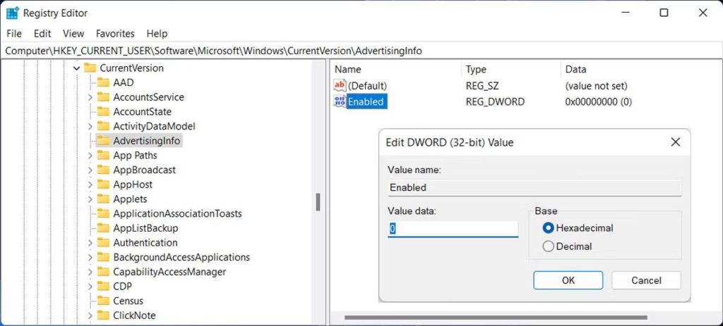 HKEY CURRENT USER > Software > Microsoft > Windows > CurrentVersion > AdvertisingInfo