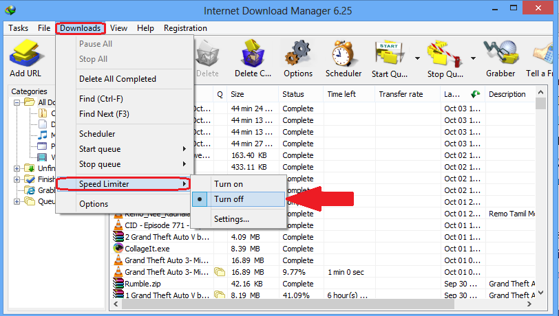 “Idman.exe”, menü çubuğundan indirme menüsüne gidin, “Hız sınırlayıcı”Sekmesi ve seçin”Kapamak".