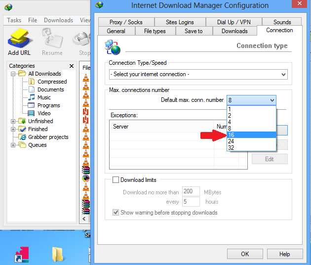 "Maksimum bağlantı" artırır. Açık "İdman.exe”“ Seçenekler ”sekmesine gidin,“Bağlantı”Sekmesi ve değiştirin“ Maks. Conn. Varsayılan ”8 ila 16. "TAMAM".