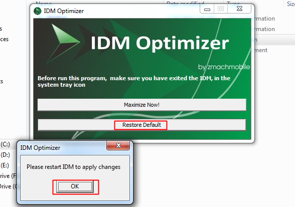 Adım 3.Şimdi sadece açıkIDM optimize ediciVe sonra aşağıda gösterildiği gibi bir pencere göreceksiniz, şimdi Maksimize düğmesine tıklayın ve bunu yap ve PC'nizi yeniden başlatmanızı isteyen bir not alacaksınız.