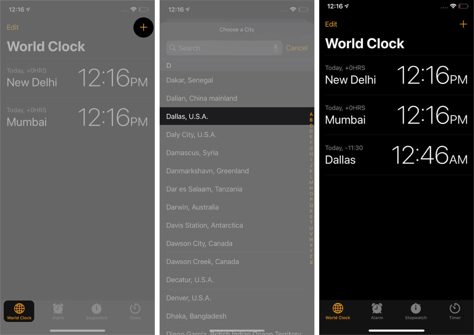 Veya seçtiğiniz bir şehir eklemek için iPhone saat uygulamasının dünya saati bölümüne gidin. Şimdi şehri buraya ekleyin. Bundan sonra, GMT saat yüzüne eklenen şehirler listesinde görünecek.