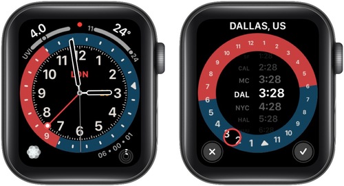 Apple Watch Series 4 ve sonraki sürümlerinde, iki zaman dilimini takip etmenizi sağlayan GMT Watch Face'i kullanabilirsiniz. İçeri yerel saati gösterir ve dış halkanın seçtiğiniz şehir zamanına sahiptir.