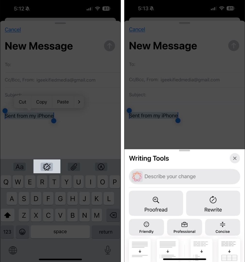 Oluştururken bir kelimeye dokunun ve basılı tutun ve tüm mesajınızı seçin. Şimdi, yüzen menüden yazma araçlarına dokunun ve gerçekleştirmek istediğiniz eylemi seçin. Yeniden yazmak için ihtiyaçlarınıza uygun bir ton seçebilirsiniz.
