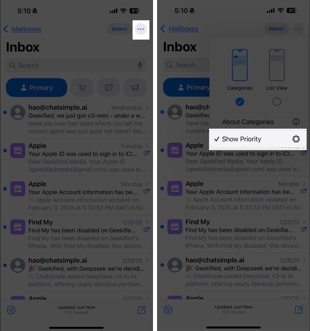 Bu özelliği kullanmak için, cihazınızın Apple Intelligence'ı desteklediğinden ve etkinleştirdiğinden emin olmanız gerekir. O zaman açınGelen kutusuPosta uygulamasında,üç noktalısimge ve seçinGöstermek Öncelik.