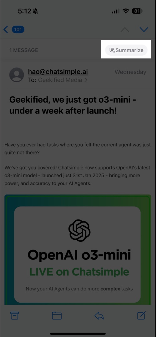 Cihazınızda Apple Intelligence aldıktan sonra bir e -posta açın veÖzetlemekdüğme. E -posta içeriğinden önemli noktaları çıkarmak ve üstte bir özet göstermek biraz zaman alacaktır.