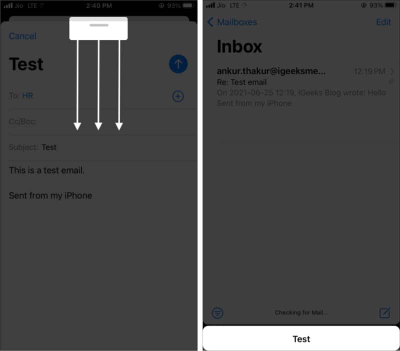 Bu durumda, oluşturma ekranını en aza indirebilirsiniz.Küçük yatay çizginin bulunduğu üstten aşağı kaydırma. Birden fazla taslağı bu şekilde en aza indirebilirsiniz. Tekrar almak için, posta uygulama ekranının altındaki minimize çubuğa dokunun.