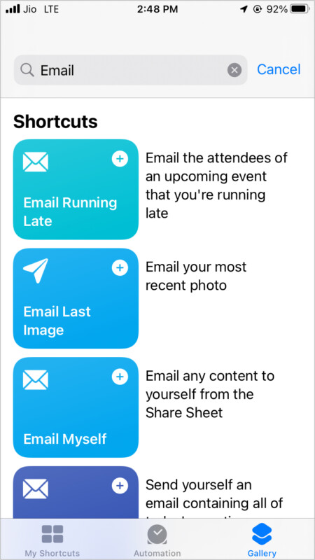 Ayrıca, kısayol uygulamasında, işleri hızlı bir şekilde yapmak için kullanabileceğiniz birkaç e -posta hilesi vardır. Kısayol uygulamasını burada nasıl kullanacağınızı öğrenebilirsiniz. Bittiğinde dokununGaleriKısayol uygulamasının içinde ve arama çubuğunu ortaya çıkarmak için aşağı kaydırın. Burada, tipe -postaApple'ın küratörlüğünü yapmak için bazı kısayolları görmek için.