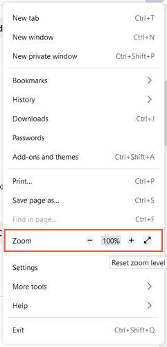 Yalnızca geçerli sayfa için bir yakınlaştırma seçmek içinUygulama Menüsüsağ üstte. YanındaZum, Zoom'u artırmak veya azaltmak için artı veya eksi düğmesini kullanın ve yakınlaştırmayı sıfırlamak için geçerli seviyeyi seçin.