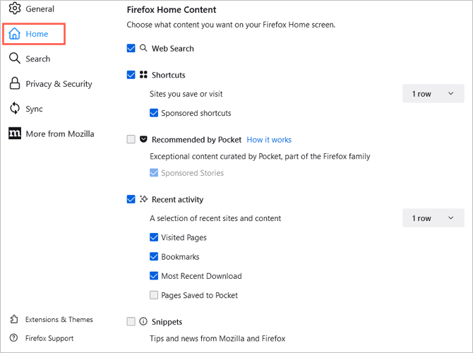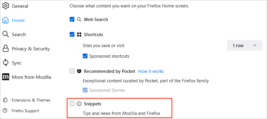 Son olarak, hem Mozilla hem de Firefox'tan ipuçlarını ve haberleri ana sayfanızda görmeyi seçebilirsiniz. Kutuyu kontrol edinSnippetsBu öğeleri görüntülemek için.