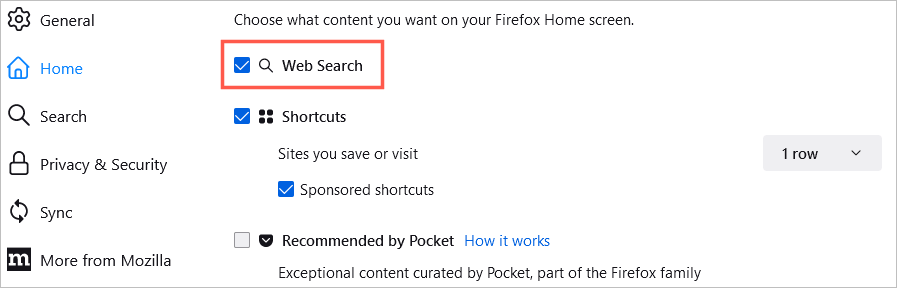 Ana sayfada bir web arama kutusu görüntülemek için kutuyu işaretleyin.Web arama.