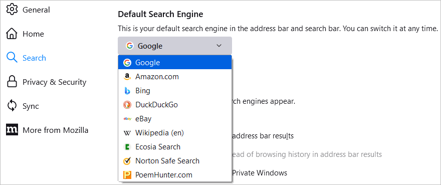 Bu kutu için varsayılan arama motorunu ve Firefox'un arama çubuğunu da seçebilirsiniz. Solda seçinAramak. Ardından aşağıdaki açılır kutuyu kullanınVarsayılan arama motoruSeçiminizi yapmak için.