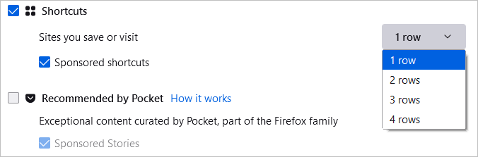 Kaydettiğiniz siteleri görüntülemek için kutuyu kontrol edinKısayollar. Ardından, sağda, görmek istediğiniz satır sayısını seçmek için açılır kutuyu kullanın. İsteğe bağlı olarak, görüntüleme seçeneğini işaretleyebilirsiniz.Sponsorlu kısayollar.