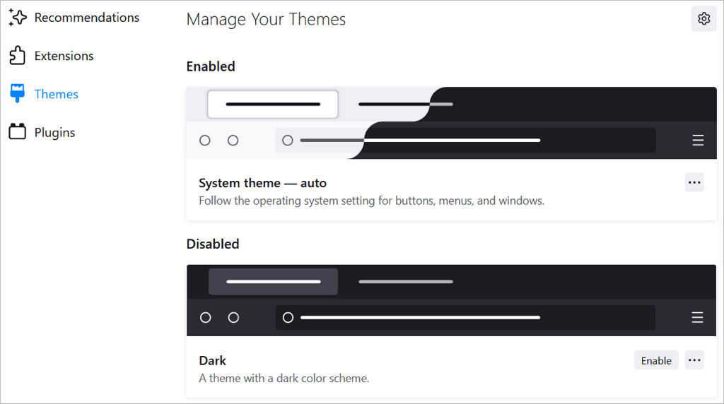 Daha sonra tarayıcının ayarlarının temalarınızı yönetme bölümünü göreceksiniz. Etkin veya devre dışı bırakılmış bölümde üstte ekran yüklediğiniz temalar. Bu, birkaç tema yüklemenizi ve basitçe seçmenizi sağlar.Olanak vermekO zaman istediğiniz kişi için.