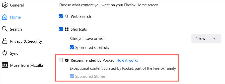 Bu sayfayı değiştirmek için geri dönUygulama Menüsü>AyarlarVe seçimEvsoldaki. Sonra özelleştirme seçeneklerini kullanın.Firefox ev içeriğibölüm.