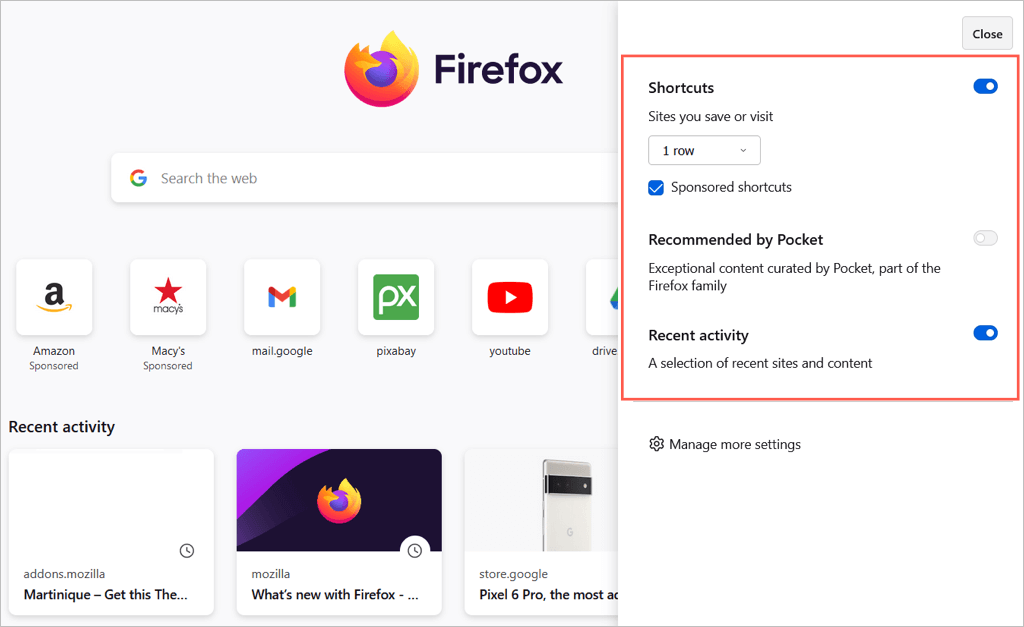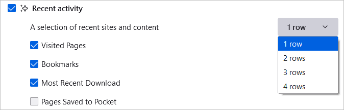 Az önce ziyaret ettiğiniz sitelere hızlı bir şekilde erişmek için kutuyu kontrol edinSon etkinlik. Ardından, görmek istediğiniz satır sayısını seçmek için sağdaki açılır kutuyu kullanın. Son etkinliği ziyaret edilen sayfalar, yer imleri ve diğer seçenekler için bu onay kutularını kullanarak özelleştirebilirsiniz.