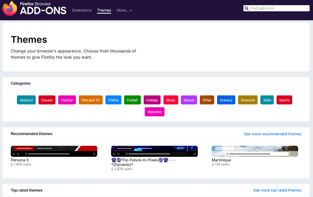 Temalara göz atmak için seçinDaha fazla tema bulunSayfanın altında. Daha sonra Firefox eklentileri mağazasında kategoriler, öneriler, trend ve en çok derecelendirilmiş temaları göreceksiniz. Bir kategori seçin veya seçinDaha Fazla GörKoleksiyonu görüntülemek için bir bölümün sağına bağlantı.