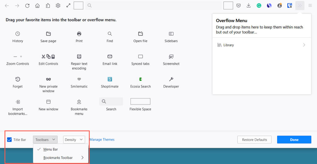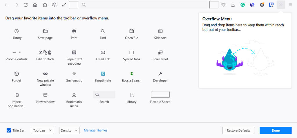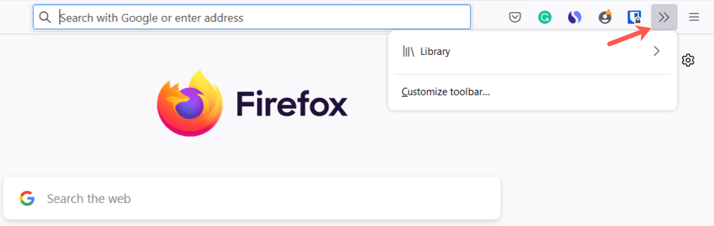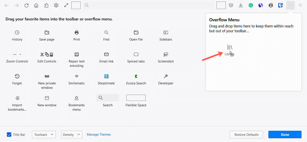 Taşma menüsüne öğe de ekleyebilirsiniz. Bu onları kullanışlı tutar, ancak ana araç çubuğu bölümünde değildir. Bir öğeyi sürükleyinTaşma menüsüpencere.