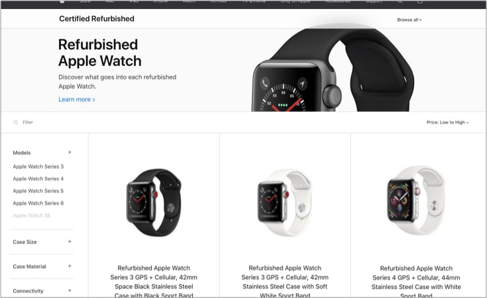REVURBME, Cherrypick perakendecilerini iyi bir geçmişe sahip - bunun için artı bir rekorla iddia ediyor! Bununla birlikte, diğerlerinden çok daha düşük olan en az 30 günlük garanti sağladıklarını hatırlamanız gerekir. Bu nedenle, yenilenmiş bir Apple Watch satın almadan önce garanti politikasını iki kez kontrol edin. Site, Apple Watch SE'yi 209 $ 'a kadar listeledi.