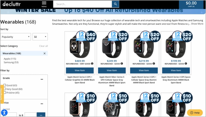 Decluttr, bazı öğelerde 90'a kadar kalite kontrolü ile kapsamlı şirket içi yenileme sunar, bu nedenle daha yüksek fiyat anlaşılabilir. Decluttr ayrıca, yenilenmiş tüm Apple saatlerinde 12 aylık sınırlı garanti ve 14 günlük sorgulanmayan para iade garantisi sunmaktadır.