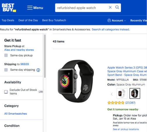 Best Buy Giriş gerekmiyor. 2002 yılında perakendeci, yenilenmiş cihazları satmak için Geek Squad ile ortaklık kurdu. Apple Watch'u fiziksel olarak kontrol etmek ve en iyisini seçmek için en yakın Best Buy mağazasına düşmenizi öneririz.