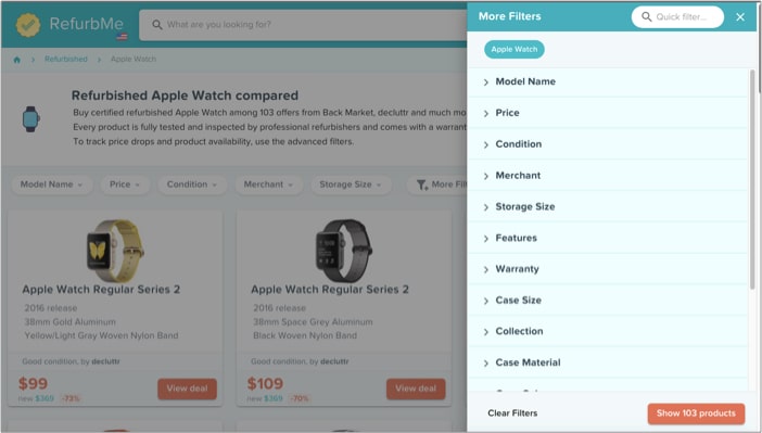 REVURBME, birçok yararlı özelliğe sahip bir toplayıcı platformudur. Aşınma ve yıpranma, garanti politikası, pil sağlığı vb. Gibi çeşitli parametreler için filtreler ve standartlar oluşturmuştur. Tüketici merkezli tasarımı ve karşılaştırma sürecini sevdim.