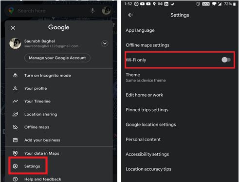 Ancak Wi-Fiyal seçeneği veri kullanımını azaltmanın harika bir yoludur, aralığının dışındayken uygulamanın çalışmasını önler. Bu ayarı açtığınızda, Google Haritalar bir Wi-Fi ağına bağlanana kadar taze veri toplar. Mobil verileri kullanırsanız, hiçbir şey güncellenmeyecektir. Bu Google Haritalar Düzeltmek için Android cihazınızda çalışma sorunu değil, bu seçeneği devre dışı bırakmanız yeterlidir.