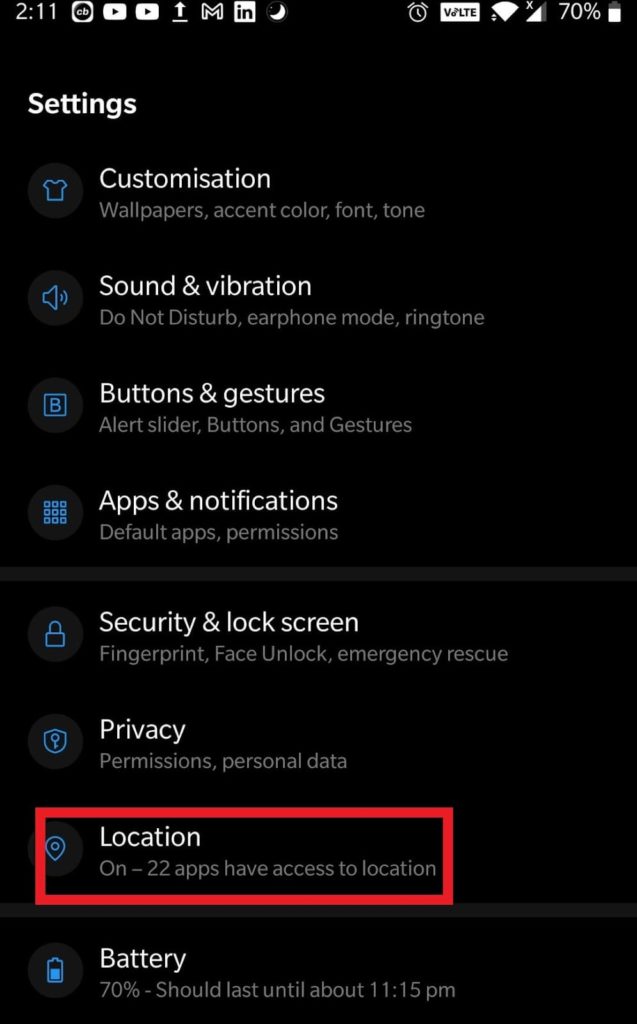 - Akıllı telefonunuzun “ayarlarını” açın ve “Konum” u bulun ve dokunun.
