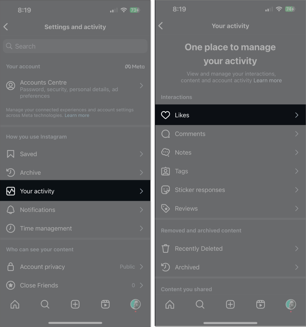 İPhone'unuzdaki Instagram profilinize gidin veÜç satır menü (☰)sağ üst köşede. SeçinaktiviteVe muslukBeğeniler. Artık sevdiğiniz bir yazı, makara ve video ızgarası göreceksiniz. Buradan, yayınlardan da farklı olabilirsiniz.