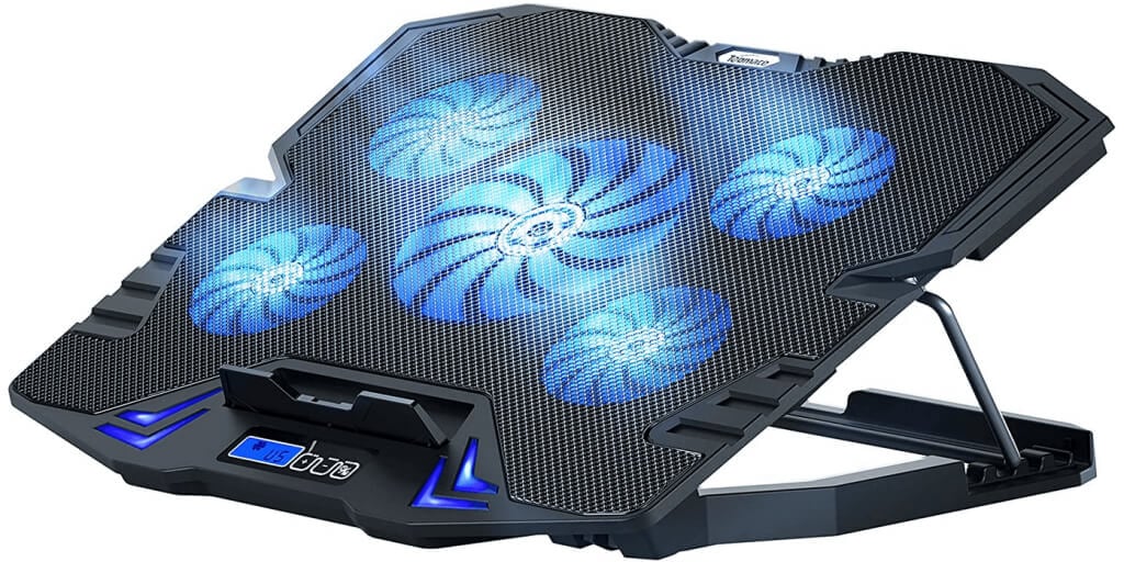 Beş soğutma fanı güçlüdür, dört dış fan daha küçüktür ve merkezi fan daha büyüktür. Oyun dizüstü bilgisayarınızın fazla çaba sarf etmeden aşırı ısınmasını önleyecekler. LCD ekranı ve soğutma pedindeki bir düğme kontrol paneli, 6 soğutma hızından biri ile üç fan çalışma modu arasında seçim yapmanızı sağlar. Pedin altında, kontrol panelinin hemen üstünde, dizüstü bilgisayarınızı yerinde tutmak için tasarlanmış kırılabilir bir menteşe de bulacaksınız.